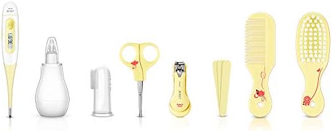 Includes: A digital thermometer, a nasal aspirator with soft and flexible tip, a finger toothbrush, a rounded-tip scissors, a pair of nail clippers and 3 emery boards
