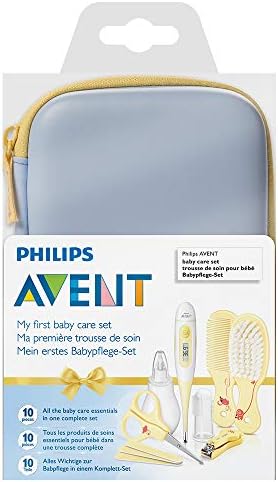 Get 10 essential baby care essentials in one compact, convenient case. Our Philips Avent Baby care set SCH400 is the ideal gift for all first-time parents. The set includes an accurate, comfortable and quickly measuring digital thermometer, soft tip nasal aspirator, finger toothbrush and nail and hair care set. The digital thermometer has professional accuracy* and the flexible tip provides extra comfort for you and your baby. The nasal aspirator helps to open your baby’s airways to help them sleep better, while the finger toothbrush is ideal for massaging a teething baby’s gums. It also includes rounded-tip scissors, nail clipper and three emery boards. Brush their hair with our Philips Avent rounded-tip comb and soft hairbrush. This is a Philips Green Product, helping to reduce costs, energy consumption and CO2 emissions. *±0.1°C between 35°C and 42 °C at room temperature 22°C