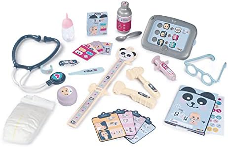 PLAY AREAS AND ACCESSORIES INCLUDED: medical equipment, self adhesive doctor’s label, doctor’s glasses, electronic tablet (batteries not included) and 30cm doll with wetting function