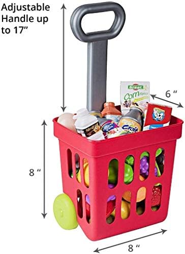 “25 PIECES: This grocery store pretend play set comes with plenty of toy food, card and coins, and a kid friendly basket with adjustable handles. “